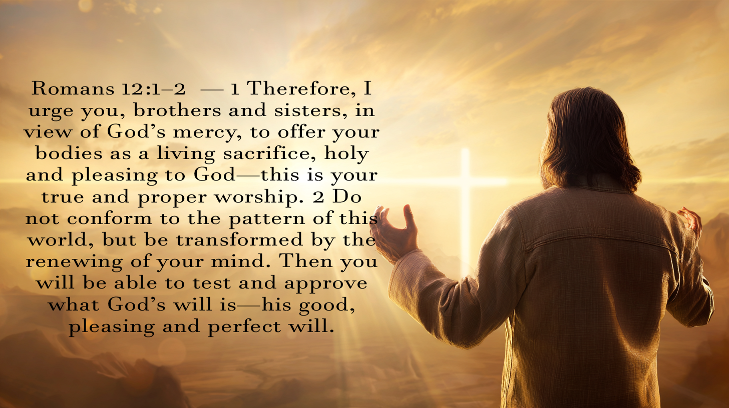 Paul urges believers, “Offer your bodies as a living sacrifice, holy and pleasing to God—this is your true and proper worship. Do not conform to the pattern of this world, but be transformed by the renewing of your mind. Then you will be able to test and approve what God’s will is—His good, pleasing, and perfect will.”