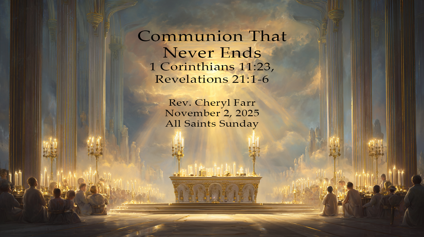 All Saints Day brings together memory and hope, grief and joy. As we name those who have gone before us, we affirm that love in Christ is never lost—it only changes form. The same Savior who welcomed them welcomes us. The same Spirit who fills heaven’s worship fills this sanctuary today. God takes the smallest things—bread, cup, memory—and fills them with eternity. Until that day when we join the feast fully, this meal sustains us with grace, strengthens our faith, and reminds us that Christ’s promise still stands: “I am making everything new.”